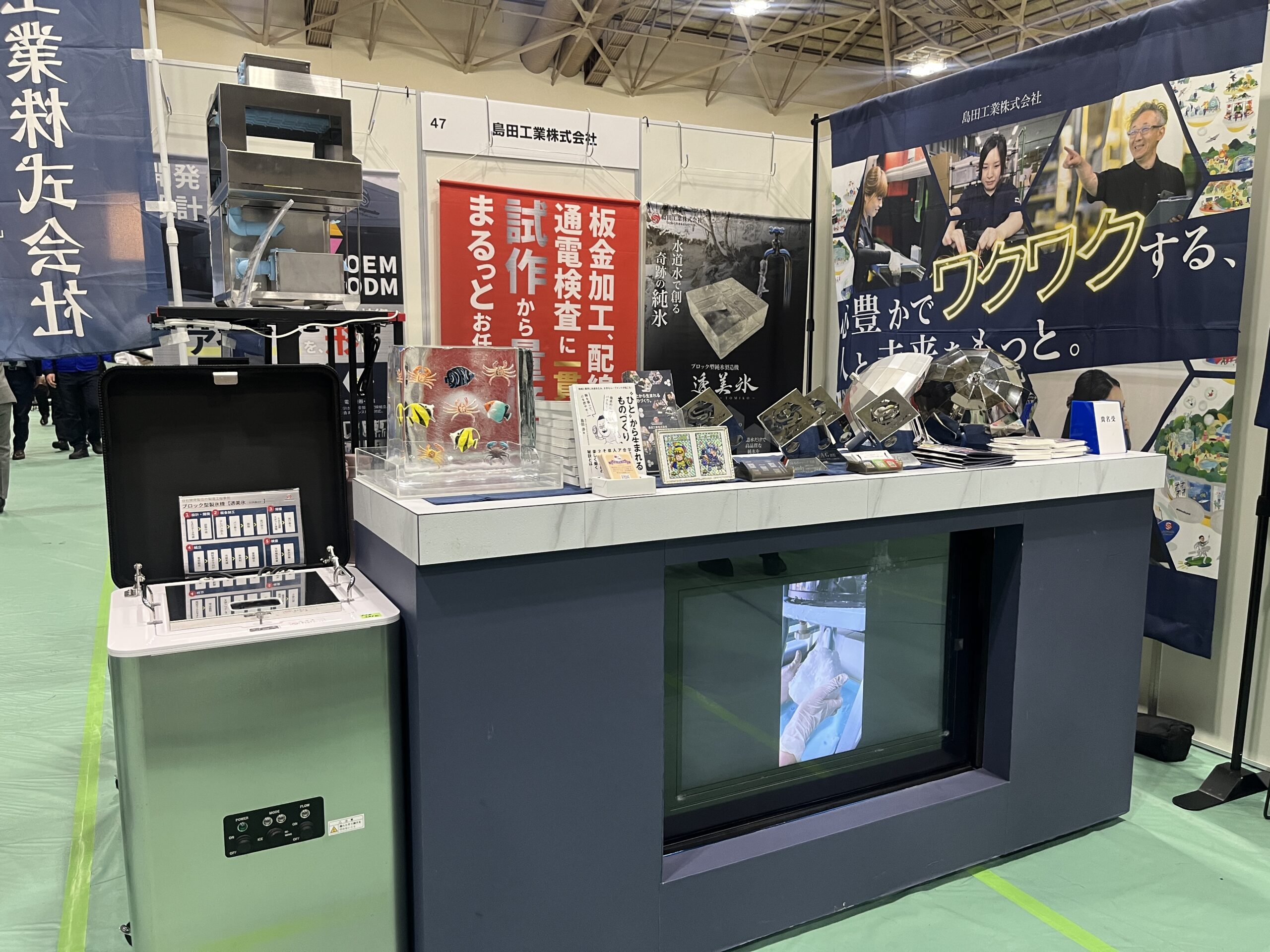 当社ブースでは、AIを搭載した協働ロボットによるファイバーレーザー溶接機のサンプル展示をはじめ、自社開発製品であるブロック型純氷製造機『透美氷 -TOMIKO-』、さらに工場内の様子やものづくりの工程を体感いただけるバーチャル工場見学の動画をご紹介しました。