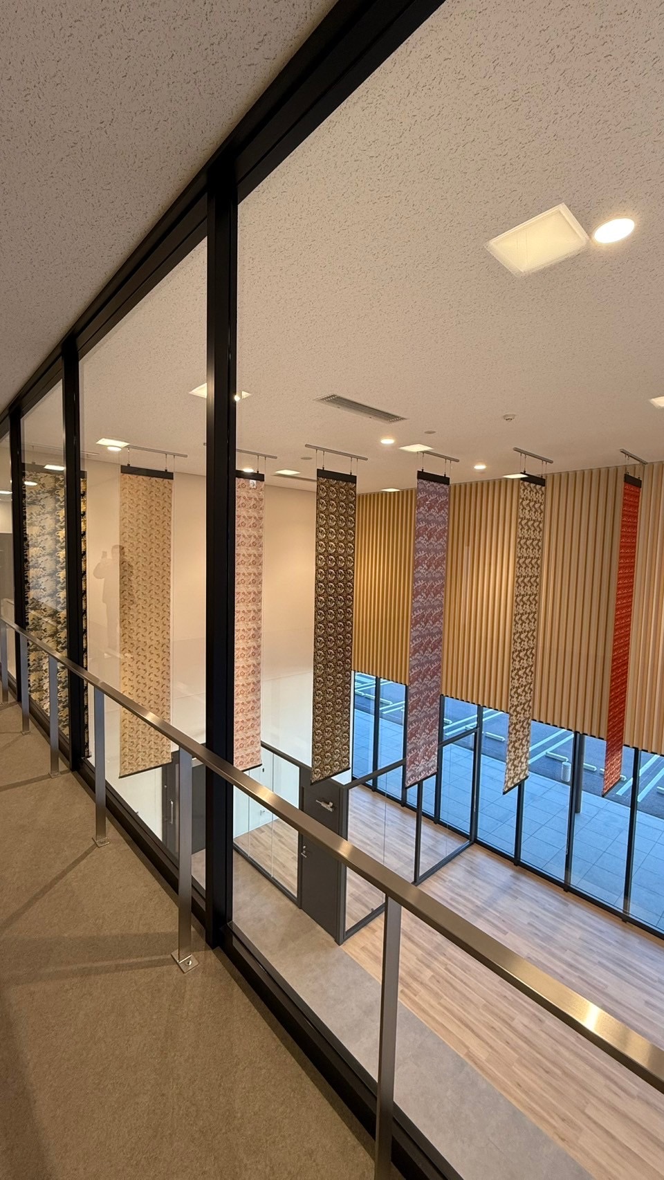 このたび、長年お世話になっている桐生信用金庫様が創立100周年を迎え、本店を新しくされるにあたり、「桐生織」を展示するための特注吊るし金具を製作させていただきました。