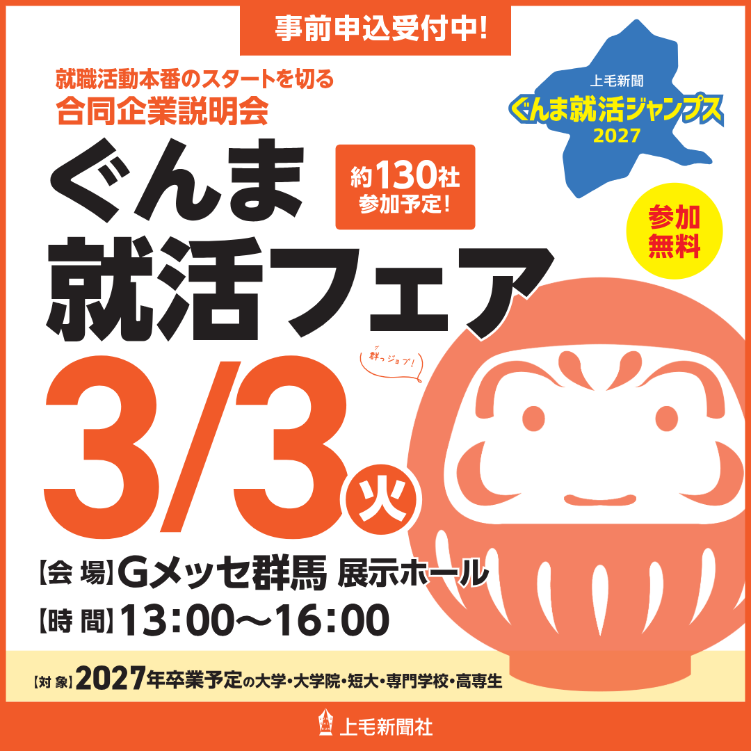 3月3日(火)Gメッセ群馬で開催の「ぐんま就活フェア」に参加させていただきます! ■開催概要 日 時 : 令和年8年3月3日(火) 13:00~16:00 会 場 : Gメッセ群馬・展示ホール (高崎市岩押町12-24) 内 容 : 合同企業説明会